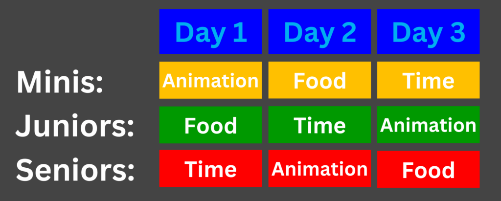 Each day, groups takes part in one of three themes: Animation, Food or Time.