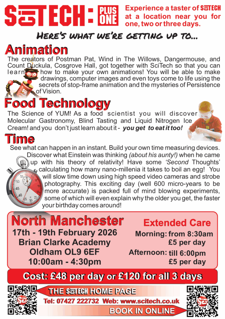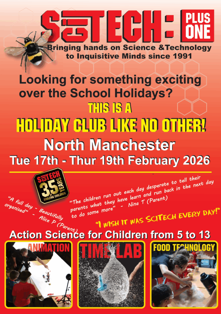 We run two SciTech +1 events each year: one in North Manchester and one in South Manchester. Both events feature the same exciting activity days, allowing us to reach a wider audience across Greater Manchester.